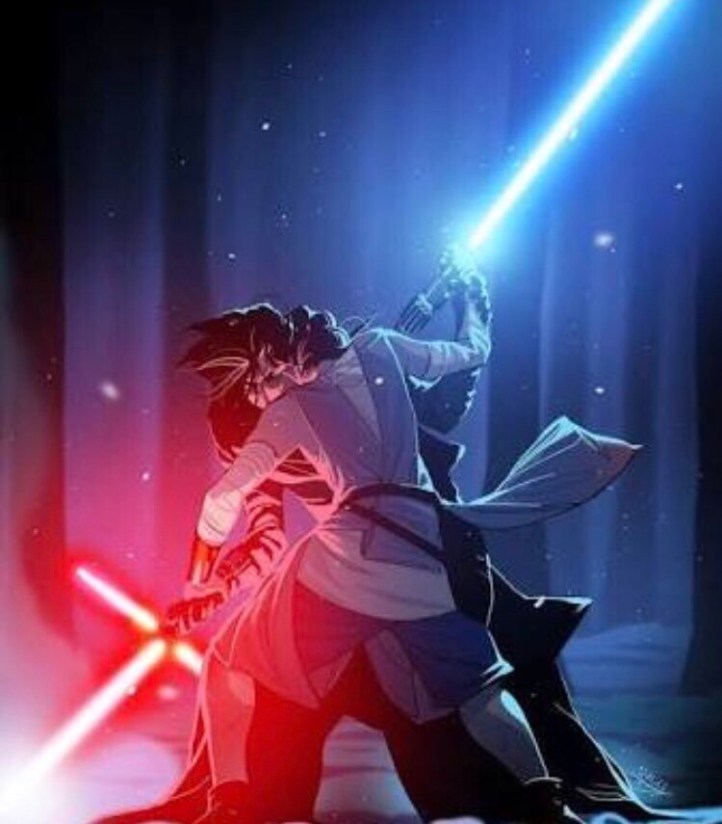 El sable de Kylo Ren es rojo y en forma de un símbolo positivo, obviamente representa a la carga positiva, el de Rey es celeste y simboliza la carga negativa, así que ya tenemos que ambos son una alegoría de la acidez, la alcalinidad, positivo, negativo, masculino y femenino.