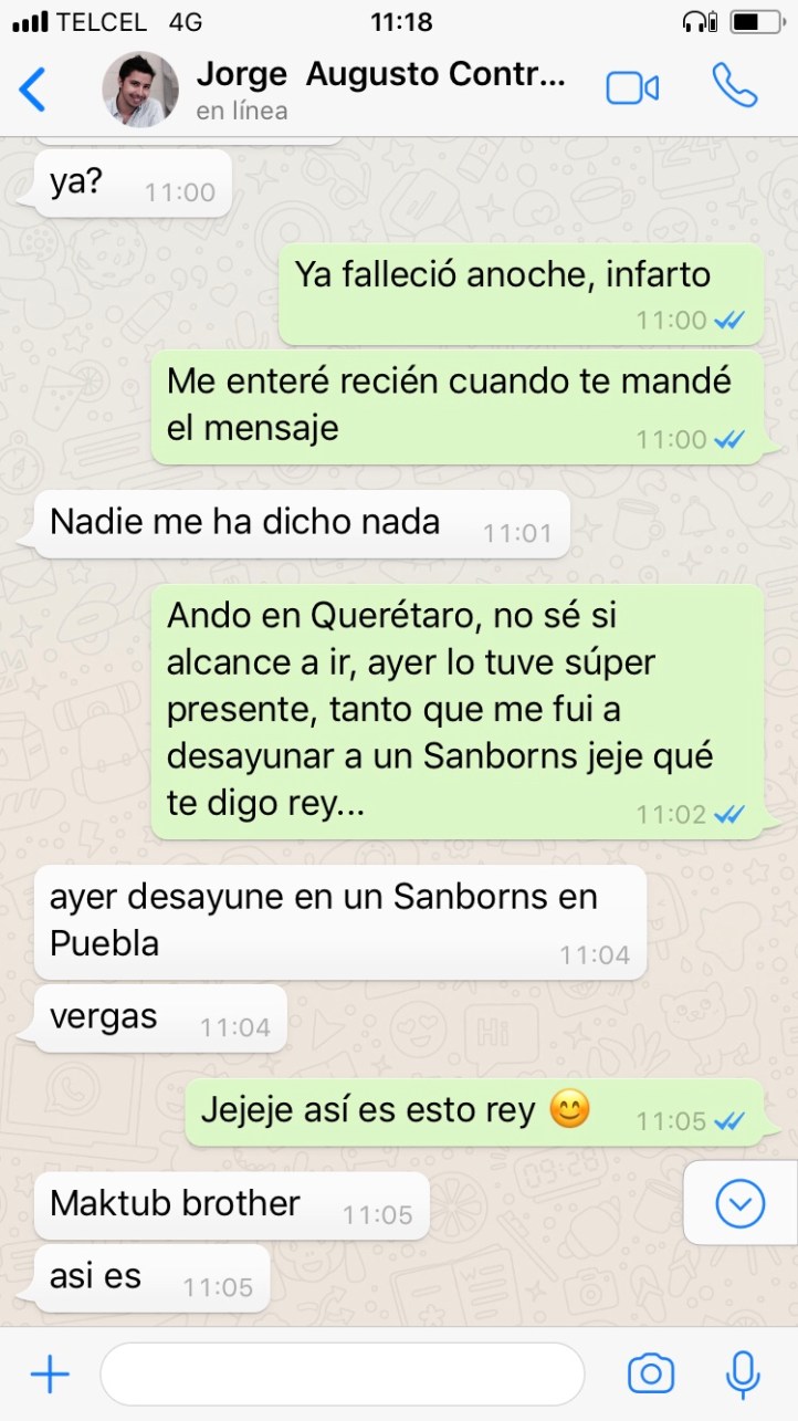 Hace poco le comentaba a unos pacientes, cómo los seres queridos nunca realmente mueren, de cómo persisten en los lugares y en todas las partes que compartieron momentos con uno, en frases o costumbres que les imitamos y solo necesitamos poner mucha atención, dejar de ver con los ojos y hacerlo más que con el corazón, con todo nuestro ser. Sé que cada que vaya a Sanborns lo recordaré ahí sentado, con su periódico El Norte, café, siempre sonriendo y estaré tentado a pedir el menú ligero.